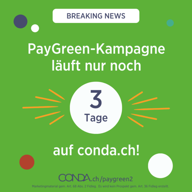 Die Crowdinvesting-Kampagne von PayGreen auf conda.ch neigt sich dem Ende zu und Du hast nur noch 3 Tage Zeit zum Investieren. PayGreen ist ein nachhaltiges FinTech, das eine Online-Bezahllösung entwickelt, die ohne Greenwashing zur CO₂-Reduktion beiträgt. Wie das genau funktioniert erfährst Du auf der Kampagnenseite, wo Du auch gleich investieren kannst: ➡️ conda.ch/paygreen2
