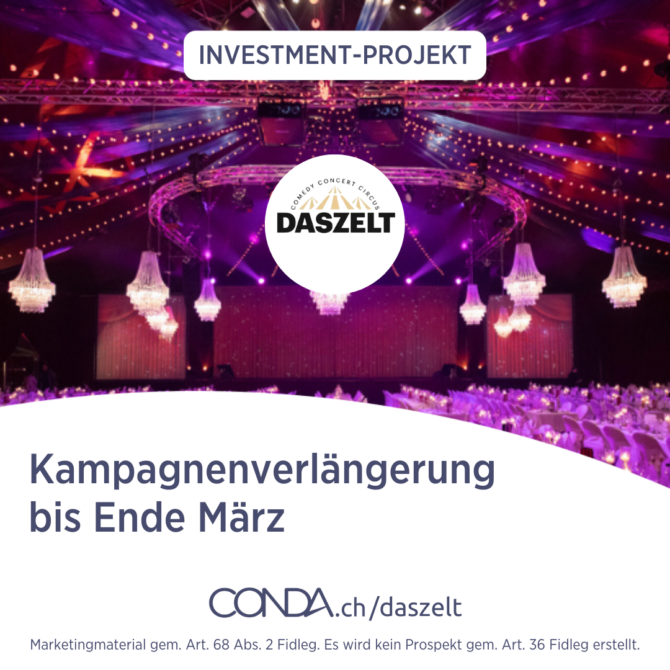 Auf conda.ch ist die Crowdinvesting-Kampagne von Das Zelt voll im Gange und die Resonanz so gut, dass die Fundingschwelle schnell überschritten wurde. Das Unternehmen hat sich nun entschieden, den Schwung mitzunehmen, um weitere Gelder einzuwerben und Investoren die Möglichkeit zur Beteiligung am Unternehmen zu geben. Es besteht nun einen ganzen Monat länger die Möglichkeit, in