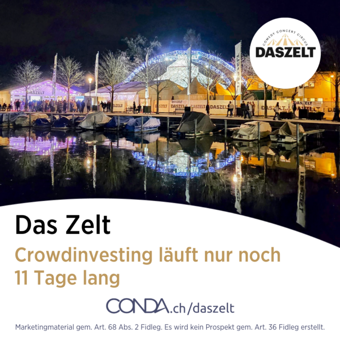Die Crowdinvesting-Kampagne von Das Zelt auf conda.ch neigt sich langsam dem Ende zu. Eine der am längsten laufenden Kampagnen auf unserer Plattform ist noch 11 Tage lang geschaltet. Bisher konnten fast 200 Investoren überzeugt werden und es kamen über 540’000 CHF zusammen. Das Zelt bietet ein einzigartiges Angebot aus Digital- und Live-Entertainment und ist in