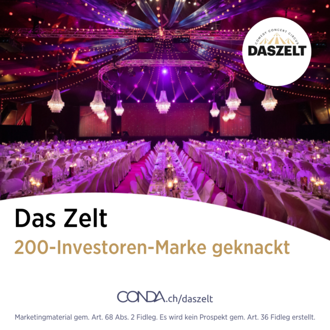 Die Crowdinvesting-Kampagne von Das Zelt auf conda.ch ist noch 4 Tage lang fĂŒr Investitionen geöffnet. Bisher möchten sich schon ĂŒber 200 Investoren am Unternehmen beteiligen und diese haben knapp 550â000 CHF bereitgestellt. Du hast also nur noch 4 Tage Zeit, Dich ebenfalls mit einer Investition an den ZukunftsplĂ€nen des Unternehmens zu beteiligen. Du findest alle