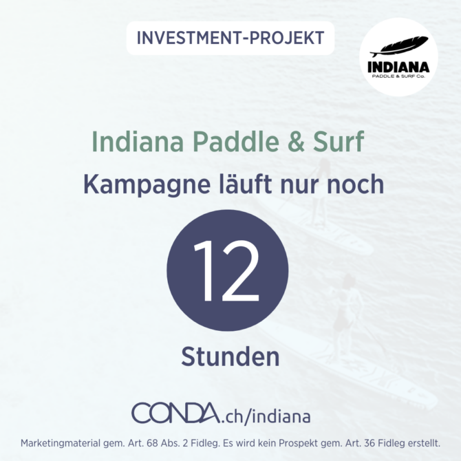 Du hast jetzt noch die Möglichkeit, in das innovative Wassersportunternehmen Indiana Paddle & Surf auf conda.ch zu investieren, indem Du an dessen Crowdinvesting auf unserer Plattform teilnimmst. Das Zürcher Unternehmen hat SUPs und Foils im Angebot, die Menschen auf der ganzen Welt begeistern. Es konnte bereits 337’000 CHF von 137 Investoren einwerben. Willst Du auch