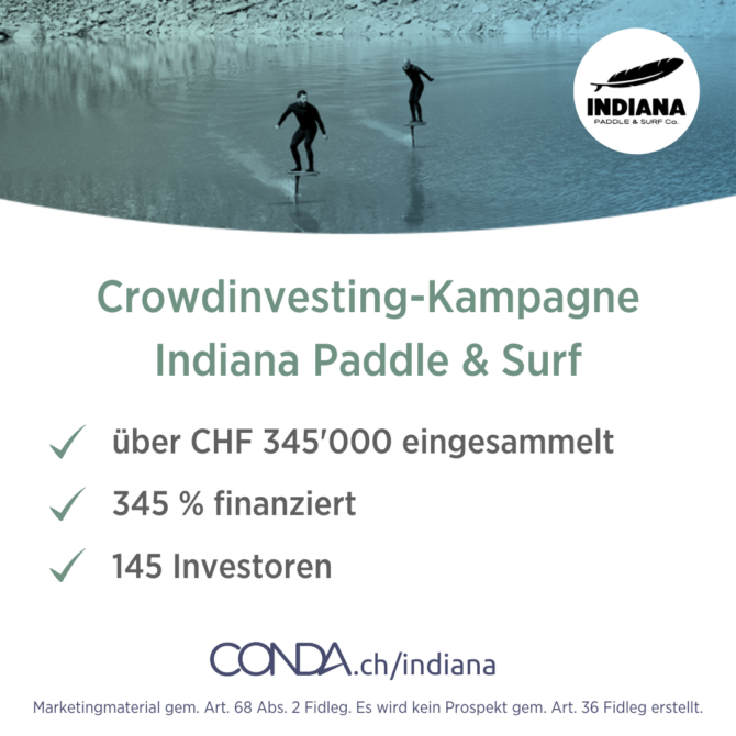 In den letzten Wochen lief die Crowdinvesting-Kampagne von Indiana Paddle & Surf – ein Zürcher Wassersportunternehmen, das SUPs und Foils für anspruchsvolle Wassersportler auf der ganzen Welt anbietet. Heute Nacht ist die Kampagne beendet worden und wir können verkünden, dass die Finanzierung mit 345 % zur Fundingschwelle erreicht wurde. Dabei haben 145 Investoren 345’010 CHF