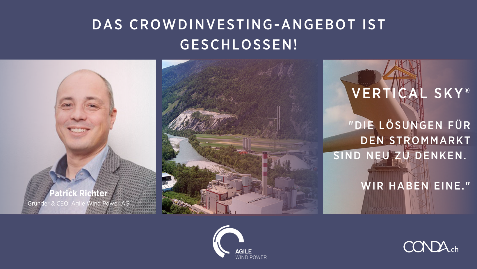 Aufgrund dieser einmaligen Perspektiven und nach Abwägung aller Interessen und Optionen, hat das Agile Wind Power-Team beschlossen, das CONDA-Crowdinvesting-Angebot zu beenden, um sich vollkommen auf die Partnerschaftsverhandlungen konzentrieren zu können. „Obwohl wir dankbar sind von dem entgegengebrachten Vertrauen aller Investoren, so sind wir doch jetzt auch davon überzeugt, auf dem richtigen Weg zu sein“, versichert CEO Richter.
