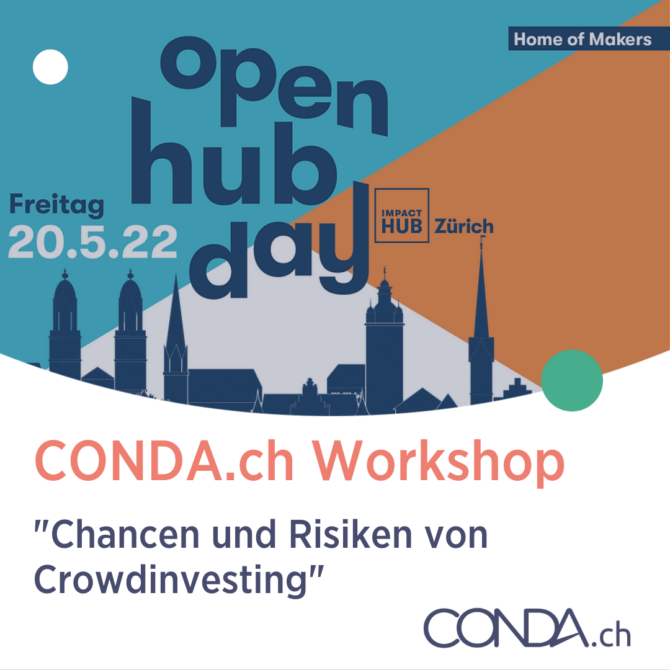 Komm am 20. Mai 2022 zum dritten Open Hub Day zu unserem Workshop zum Thema „Chancen und Risiken von Crowdinvesting“, erhalte spannende Insights und lerne CONDA.ch persönlich kennen!