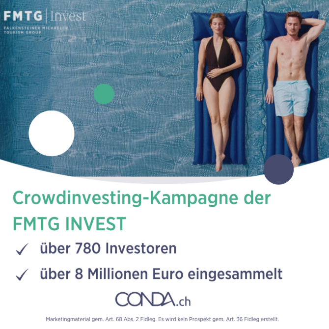 Falkenstein Hotels: Rekord Crowdinvesting wurde mit CONDA-Technologie erfolgreich abgeschlossen! Insgesamt sammelten über 780 Investoren aus Österreich, Deutschland und der Schweiz mehr als 8 Millionen Euro ein! Damit ist die 65 Jahre-Jubiläumskampagne die erfolgreichste Crowdinvesting-Kampagne in der Falkensteiner Geschichte. Der Start der eigenen Crowdinvesting-Plattform FMTG Invest mit der 8. Crowdinvesting Kampagne ist damit ein riesiger Erfolg.