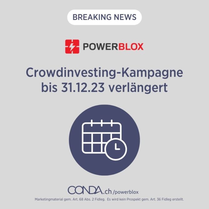 Die Crowdinvesting-Kampagne von Powerblox auf conda.ch läuft erfolgreich und bereits 120 Investoren beteiligen sich mit weit über 200’000 CHF an den revolutionären Energiewendeplänen des Unternehmens.☀️🍃🔌 Um den Erfolg auszubauen, geht Powerblox in die Verlängerung und bietet den Interessierten nun bis zum 31.12.2023 die Möglichkeit zum Investieren. Im Hintergrund war Powerblox bereits fleissig und hat weitere