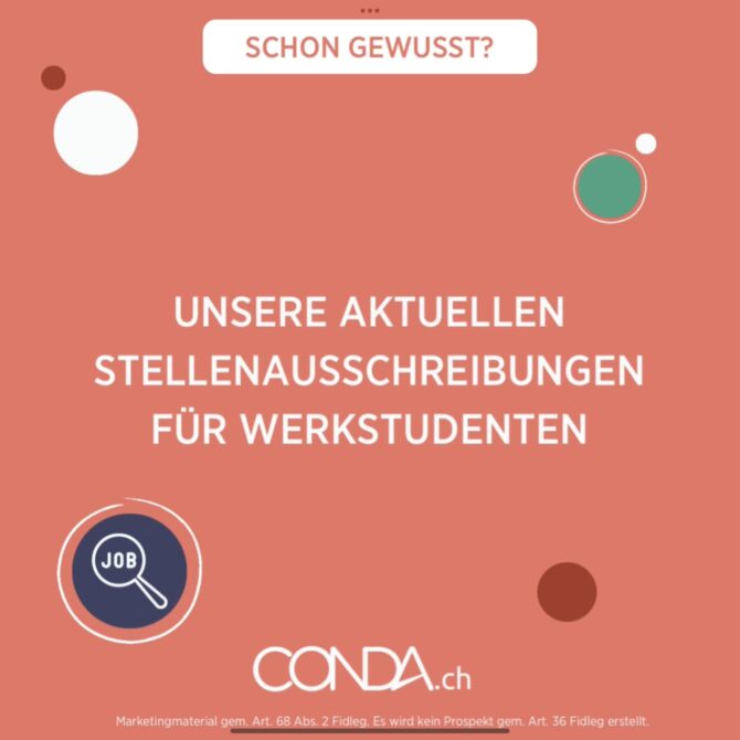 Bist Du Student und auf der Suche nach der perfekten Werkstudententätigkeit? Dann bewirb Dich jetzt bei CONDA.ch!🚀 Momentan suchen wir engagierte Werkstudenten, die ✅ im Customer Management und ✅ im Online Marketing aushelfen. Als Teil unseres Teams hast du die Möglichkeit, unsere Kunden bei ihren Crowdinvesting-Kampagnen zu unterstützen, in einem dynamischen Arbeitsumfeld zu arbeiten und