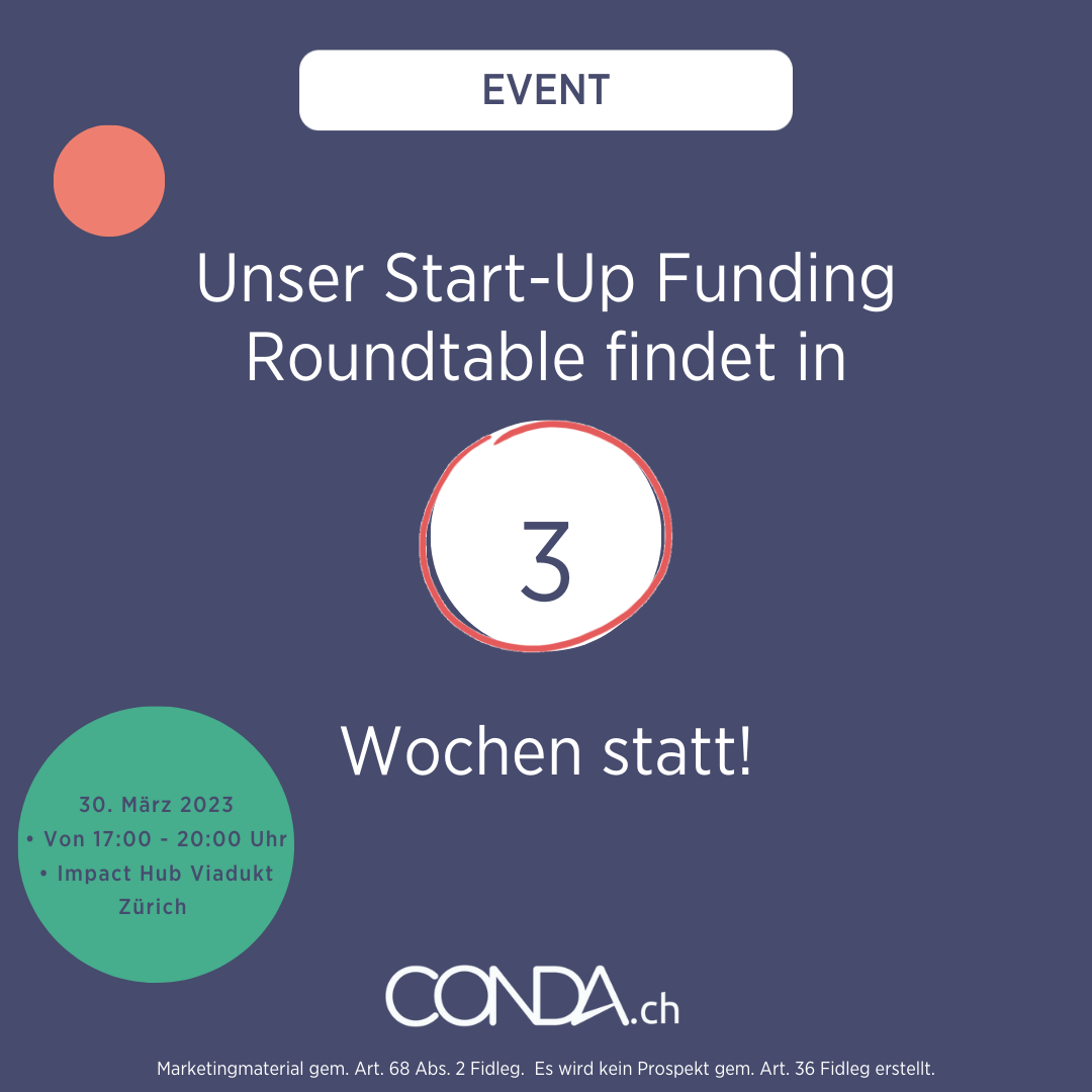 Heute in drei Wochen findet unser Start-Up Funding Roundtable in Zürich statt. Dort werden wir über Finanzierungsquellen und den Vorzügen des Crowdinvestings diskutieren. Exklusiv werden die Gründer von conda.ch sowie die Gründer eines Start-Ups, dass bereits erfolgreich eine Crowdinvesting-Finanzierungsrunde abgeschlossen hat, dabei sein und die wichtigsten Dinge, die man bei Finanzierungen und besonders beim Crowdinvesting beachten muss, erklären.