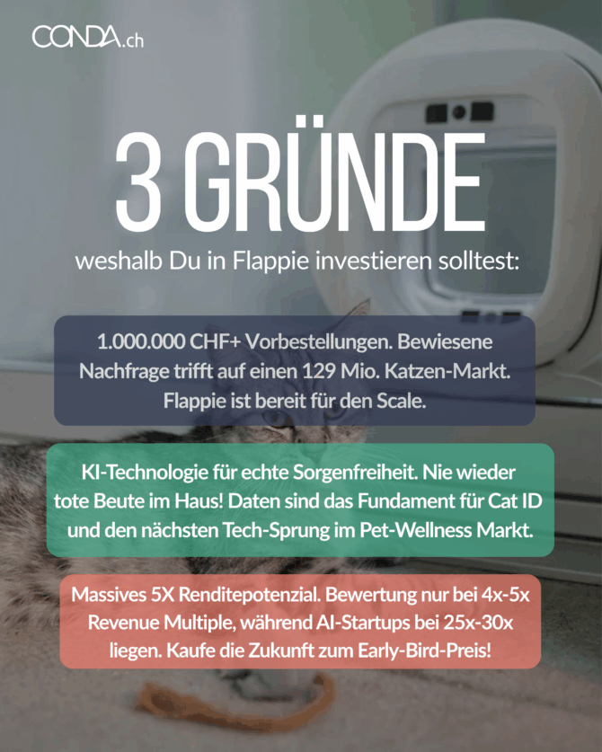 Die weltweit erste KI-Katzenklappe bringt echte Ruhe ins Zuhause – und öffnet die Tür zu einem Milliardenmarkt im PetTech-Segment. Flappie ist nicht nur eine smarte Lösung für Katzenbesitzer, sondern ein Technologieträger, der den Zugang zu einem schnell wachsenden Markt für Haustier-Innovation schafft. 💡 1️⃣ Markt bestätigt: Über CHF 1 Mio. an Vorbestellungen Der Erfolg spricht