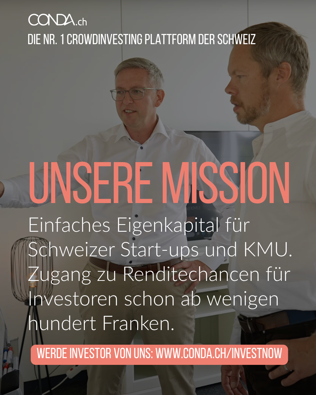 In der Schweiz gab es lange keinen einfachen Weg, sich als Privatperson direkt an innovativen Schweizer Unternehmen zu beteiligen. Börse, Immobilien, Konsumentenkredite – alles verfügbar. Eigenkapital für Start-ups und Wachstumsunternehmen? Komplex, intransparent, schwer zugänglich. CONDA.ch ändert das: Wir demokratisieren Beteiligungen an Schweizer Start-ups und KMU Unternehmen erhalten digitalen, transparenten Zugang zu Kapital – plus Know-how und Community. Investoren beteiligen sich direkt an den spannendsten Schweizer Erfolgsgeschichten – einfach, digital, fair, vielfältig.