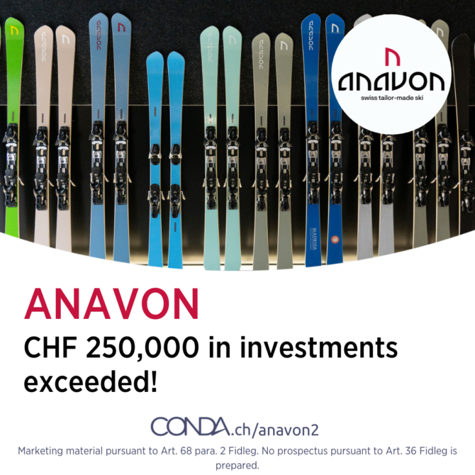 Premium ski manufacturer Anavon has cracked the CHF 250,000 investment mark with its crowdinvesting campaign on conda.ch. A total of 77 investors have already decided to support the company with their funds. The company has already passed the funding threshold of CHF 100,000 and the funding target of CHF 500,000 is now within reach. You