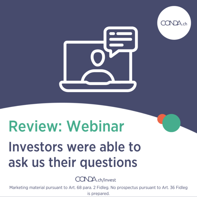 Our own public crowdinvesting campaign has been running since 27 May and we are absolutely overwhelmed by the success of the prefunding round with our community! In order to give other investors the opportunity to become part of the CONDA.ch family and to clear up any remaining questions or uncertainties, we held a webinar on