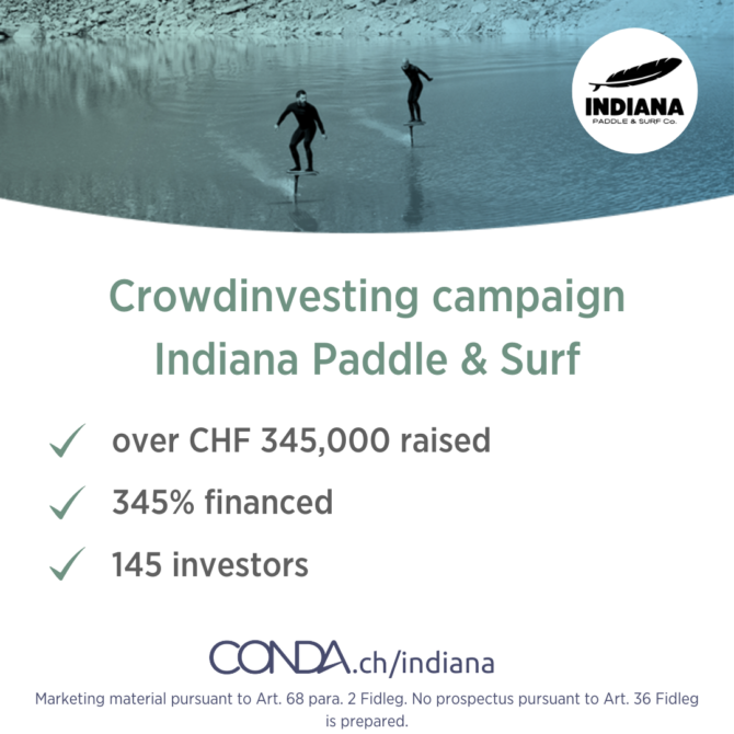 In recent weeks, the equity crowdfunding campaign of Indiana Paddle & Surf – a Zurich-based water sports company that offers SUPs and foils for demanding water sports enthusiasts around the world – has been running. The campaign ended last night and we are pleased to announce that the funding target was reached with 345% of