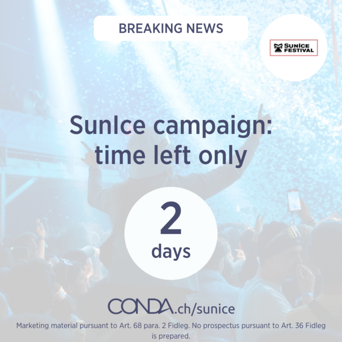 Act quickly now – only 2 days left to become a co-owner of SunIce ⌛ Take this opportunity and become a co-owner of the renowned lifestyle festival in the Swiss Alps today. Already 40,000 visitors, 3.99 million sales and over 40 national and international partnerships. Our goal? To grow even more! The crowdinvesting campaign will