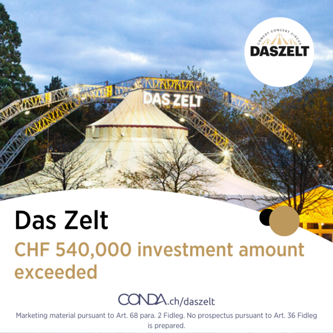 The Das Zelt crowdinvesting campaign on conda.ch is slowly coming to an end. One of the longest-running campaigns on our platform is still running for 11 days. So far, almost 200 investors have been convinced and over CHF 540,000 has been raised. Das Zelt offers a unique combination of digital and live entertainment and is