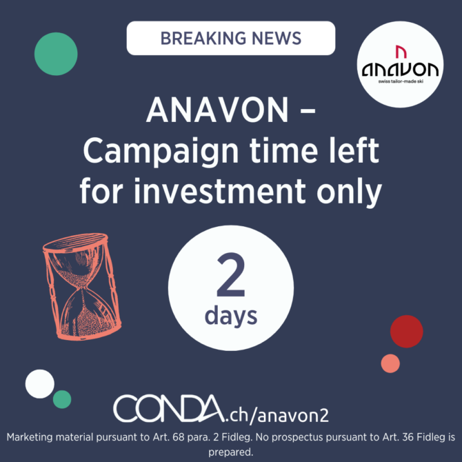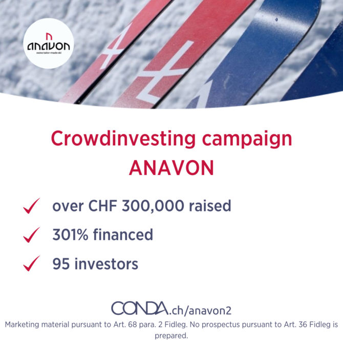 The Anavon crowdinvesting campaign on conda.ch has only 11 hours left to run. Now is your last chance to become a shareholder in this innovative premium ski manufacturer. So far, 92 investors are convinced by the company and have provided almost CHF 300,000. You can find the campaign information and the investment function at ➡️