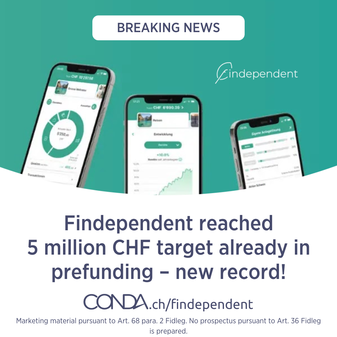 We at conda.ch have fantastic news for you. You may not have realised it, but Findependent has already reached its funding target of no less than CHF 5 million in the prefunding phase on conda.ch! This is a new record for Conda!