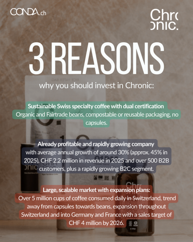 Chronic. is the sustainable Swiss coffee brand that makes specialty coffee accessible to everyone. Currently experiencing strong growth, it is entering a new phase of expansion and inviting the community to participate.
