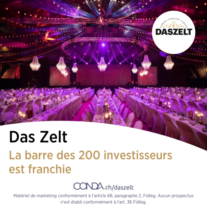 La campagne de crowdinvesting de Das Zelt sur conda.ch est encore ouverte aux investissements pendant 4 jours. Jusqu’à présent, plus de 200 investisseurs souhaitent déjà participer à l’entreprise et ils ont mis à disposition près de 550 000 CHF. Il ne te reste donc plus que 4 jours pour participer aux plans d’avenir de l’entreprise
