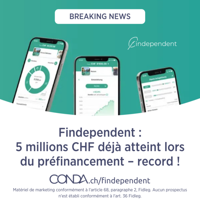 Chez conda.ch, nous avons des nouvelles fantastiques pour toi. Tu ne l’as peut-être pas remarqué, mais Findependent a déjà atteint son objectif de financement de pas moins de 5 millions de CHF sur conda.ch lors de la phase de préfinancement. Cela représente un nouveau record pour Conda ! Findependent est une application suisse d’investissement ETF