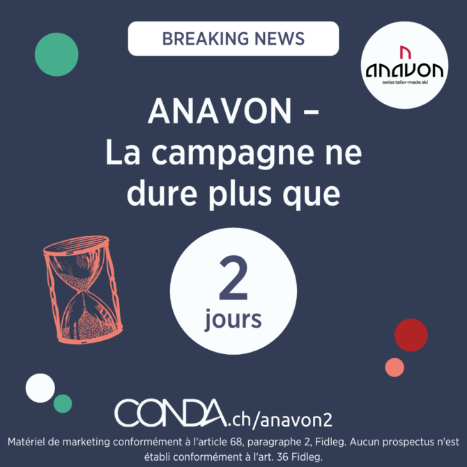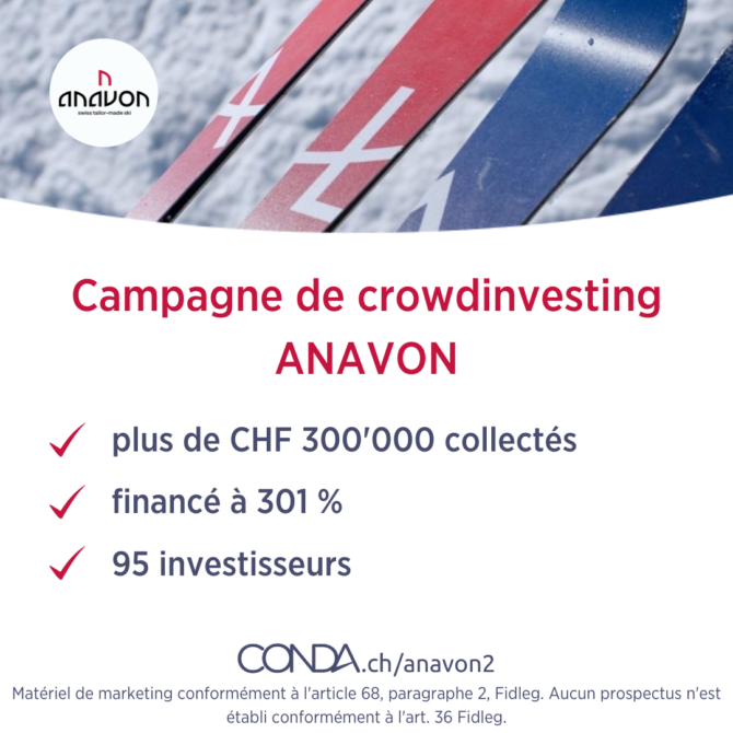 La campagne de crowdinvesting d’Anavon sur conda.ch ne dure plus que 2 jours, jusqu’au 15/03/24 23:59h. Actuellement, 86 investisseurs ont investi près de 300 000 CHF. Tu as encore la possibilité de devenir copropriétaire de la manufacture de ski premium innovante Anavon. Tu trouveras toutes les informations nécessaires sur la page de la campagne :