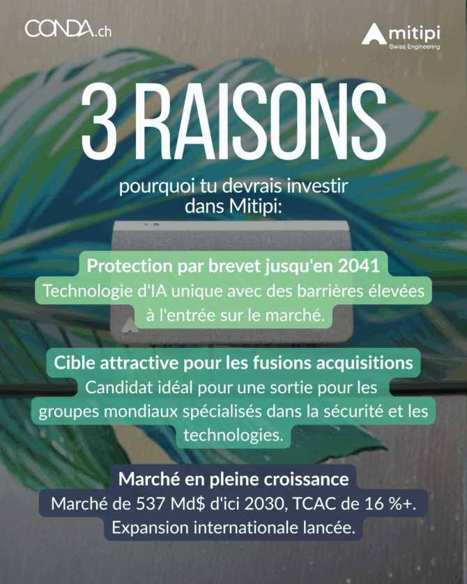 Nous avons créé KEVIN®, le système de sécurité suisse basé sur l'IA qui prévient les cambriolages avant qu'ils ne se produisent. En simulant une présence humaine réaliste à l'aide de lumières, d'ombres, de voix, de sons et de routines, KEVIN® assure la sécurité des maisons et des entreprises. Breveté aux États-Unis, dans l'Union européenne, au Royaume-Uni et en Suisse jusqu'en 2041, Mitipi est une cible M&A de premier plan pour les entreprises technologiques et de sécurité. Votre investissement nous permettra d'améliorer l'IA, de nous développer dans de nouveaux secteurs et de nous étendre à l’international.