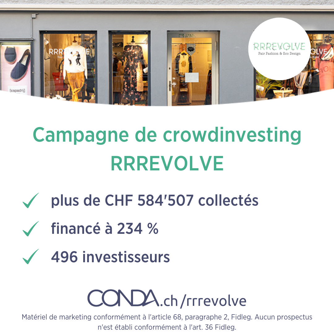 À minuit, la campagne de crowdinvesting de RRREVOLVE sur conda.ch s’est terminée. L’entreprise a réussi à récolter un montant impressionnant de 584 507 CHF auprès de 496 investisseurs et a ainsi pu atteindre son seuil de financement à 243 %.
