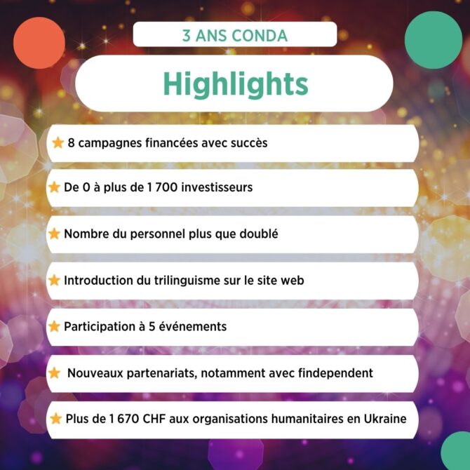 Participez Ă la rĂ©union oĂč l’innovation rencontre l’inspiration ! Lors du CONDA.ch ApĂ©ro & Pitch Event le 5 dĂ©cembre. Notre Ă©vĂ©nement vous propose un mĂ©lange rĂ©ussi d’idĂ©es de startups, de success stories et d’opportunitĂ©s d’investissement exclusives.