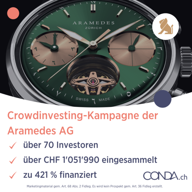 Seit Sonntag ist eine neue Crowdinvesting-Kampagne auf CONDA.ch live: Aramedes – Cleverer Luxus. Bereits im Prefunding wurden über CHF 614’000.- investiert und somit die Fundingschwelle nicht nur erreicht, sondern bei weitem übertroffen! Die Nachfrage nach Aramedes ist also gross.