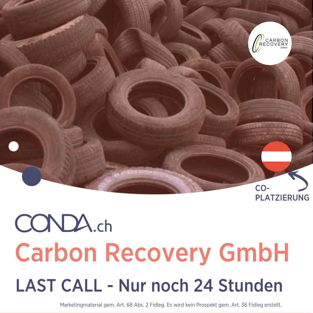 Nur noch für 24 Std. kannst Du in das Unternehmen Carbon Recovery auf CONDA.at investieren. Investiere heute noch und sichere Dir Basiszinsen von 6,5 % p.a.!