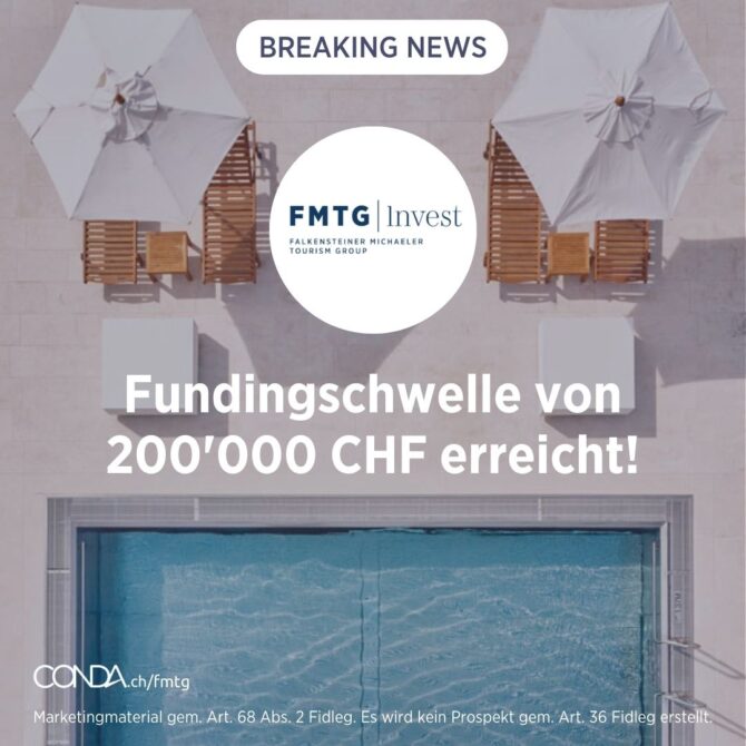Über das Wochenende haben auf conda.ch weitere Investoren in die Crowdinvesting-Kampagne der Falkensteiner Michaeler Tourism Group investiert.🤝 Die Investoren stellen gemeinsam nun einen Betrag von über 230’000 CHF bereit und überschreiten damit die Finanzierungsschwelle von 200’000 CHF. Wir freuen uns für FMTG und drücken dem Unternehmen für die 15 verbleibenden Tage der Kampagne die Daumen,