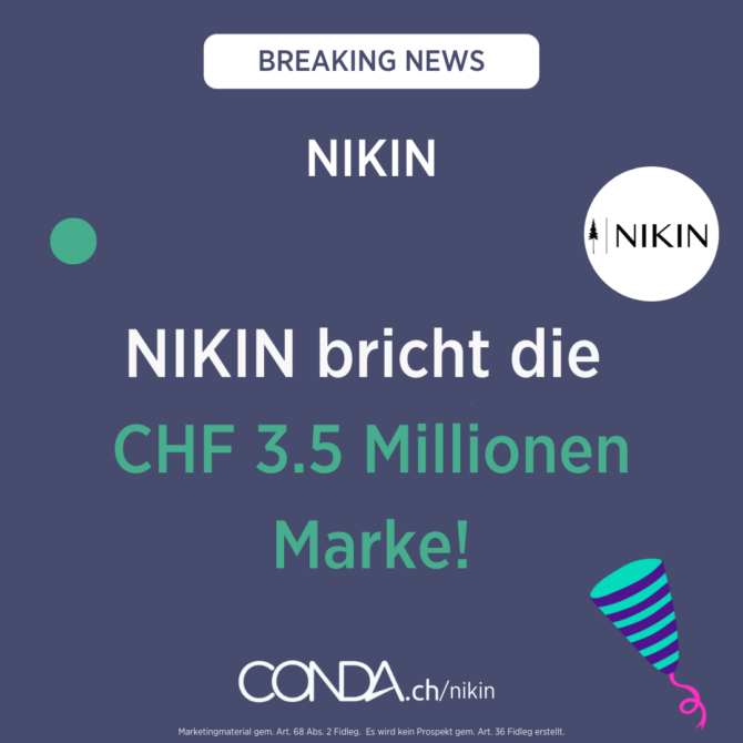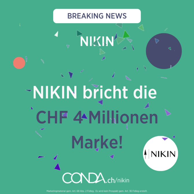 Der absolute WAHNSINN! NIKIN ist seit zwei (!) Wochen online und knackte heute die CHF 4-Millionen-Marke! Wir sind überwältigt, und freuen uns, dass wir zusammen mit NIKIN bisher so zahlreiche Investoren finden konnten. Wir sagen: weiter so! Du möchtest auch investieren? Dann beeile Dich, die Kampagne wird bei CHF 5 Millionen geschlossen! Investiere noch heute