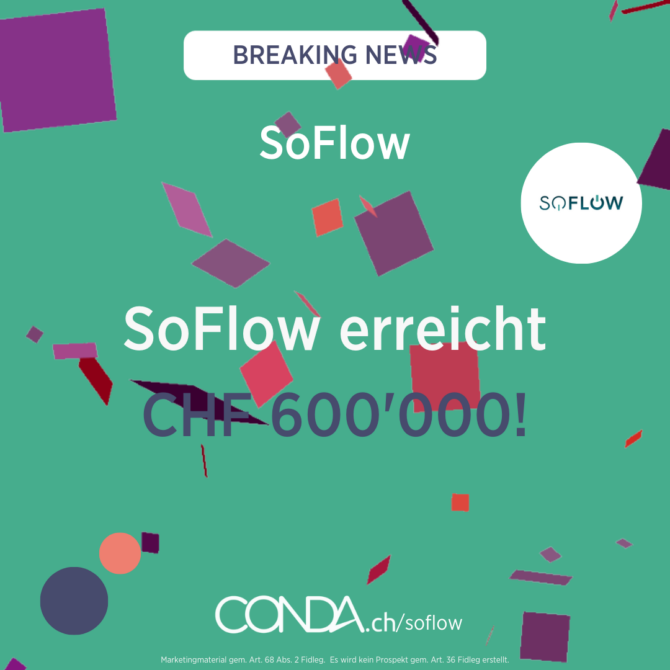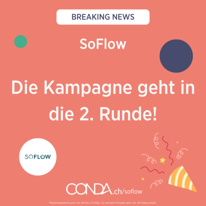 Am 5. Oktober letzten Jahres ging unsere Kampagne mit SoFlow zum ersten Mal live auf CONDA.ch – nach knapp 9 Monaten engagierter Zusammenarbeit und zwei gelungenen Finanzierungsrunden, wurde die Crowdinvesting-Kampagne von SoFlow nun erfolgreich abgeschlossen! 💪 Insgesamt haben 391 Investoren an beiden Runden teilgenommen und SoFlow mit CHF 874’068 zu 874 % finanziert – mit
