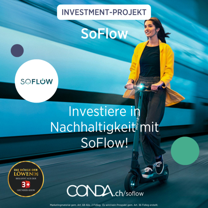 Juhuu! SoFlow feiert seinen 80. Investor! Nach nur 6 Wochen hat SoFlow schon zahlreiche Investoren gewonnen. Mikromobilität ist die neue Ära der smarten Fortbewegung. SoFlow hatte den grössten Deal aller Zeiten bei der „Höhle der Löwen“ Schweiz bekommen und nun haben auch die Investoren von CONDA.ch die Möglichkeit, in dieses erfolgreiche Unternehmen zu investieren. Wirst