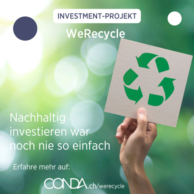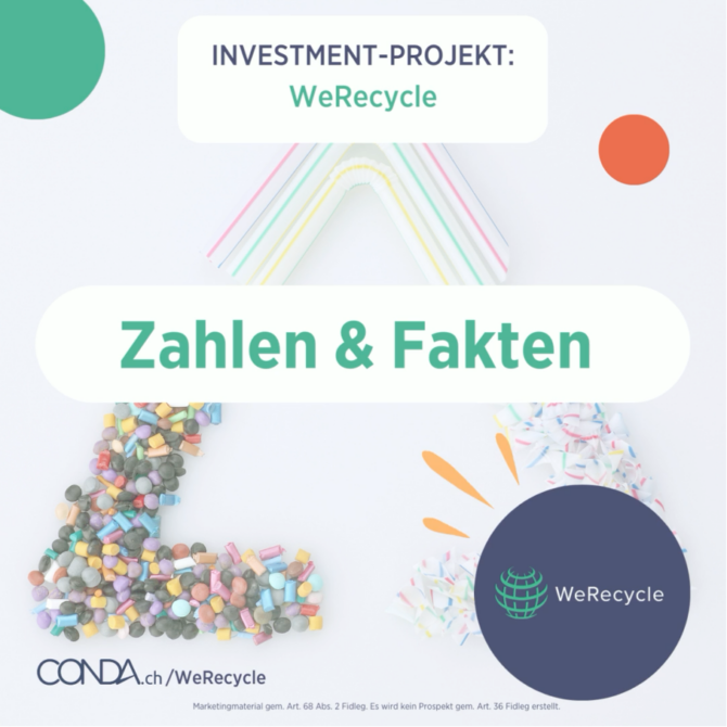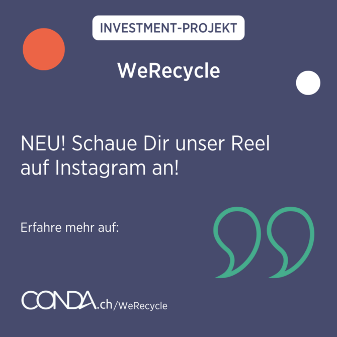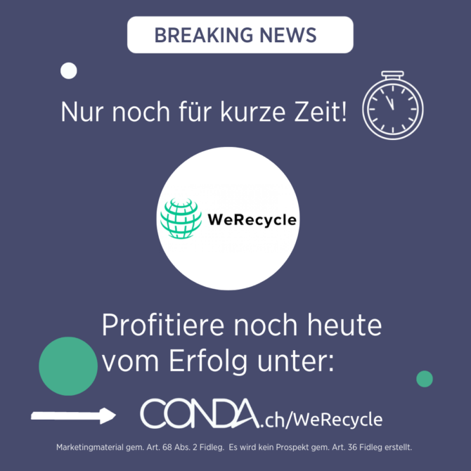 Aufgepasst: Du hast nur noch 9 Stunden Zeit, in WeRecyclezu investieren und von ihrem Erfolg zu profitieren. Hier sind die wichtigsten Eckdaten für Dich zusammengefasst: ✅ Investitionsbetrag: ab CHF 450 ✅ Fundingschwelle (CHF 75’000) bereits erreicht ✅ nachhaltige Recyclinglösung mit CO2 Einsparung ✅ jährliche Dividendenzahlung bei positivem Jahresergebnis Jetzt unter 👉 conda.ch/werecycle 👈  investieren!