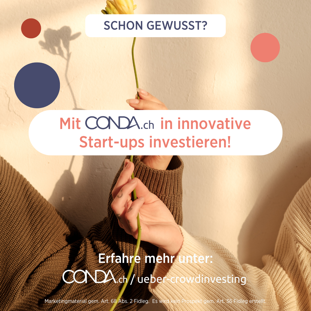 Conda.ch ist für alle da. Für Unternehmen bietet unsere Crowdinvesting-Plattform die perfekte Möglichkeit, ganz einfach Kapital aufzunehmen. Für Investoren wiederum ist es DIE Chance, in spannende, innovationsfreudige Start-ups sowie KMU und Immobilien zu investieren. Online und unkompliziert können Privatpersonen bereits mit kleinen Geldsummen (ab CHF 100.-) investieren und gleichzeitig Unternehmen unterstützen, die die Welt verändern möchten. 💪🏽